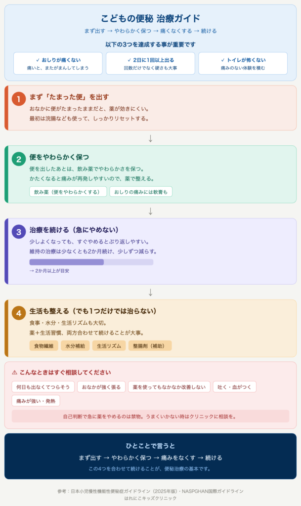 まず出してから、便のやわらかさを保つ薬(維持治療)に進むと、改善が早く安定しやすいです。