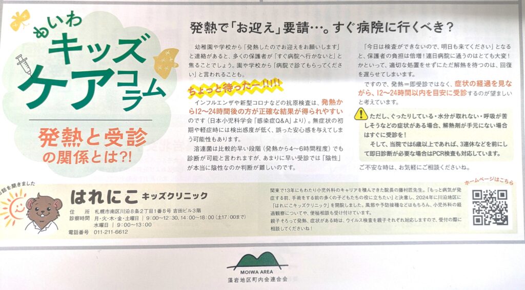 こんにちは!はれにこキッズクリニックです👶🏽🏥藻岩地区町内会連合会が発行している「もいわ子ども新聞」に、当院のキッズケアコラムが掲載されました🎉